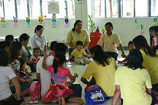 หลังจากนี้คุณครูก็ให้เด็กๆ ไปเล่นของเล่น วาดรูป เท่าที่ดู เด็กๆ ก็มีอายุประมาณธีร์ และน้อยกว่า บางคนแค่ 2 ขวบเองมั้ง อีกหลายคนก็ตัวเล็กเกินธีร์ไปเยอะ หม่าม้าก็เดาไม่ถูกว่าอายุเท่าไหร่ ส่วนใหญ่ในห้องเป็นเด็กผู้หญิง ธีร์นี่ก็จัดว่าอยู่ใน top 5 ของเด็กที่ตัวโตๆ ในห้องเรียน (หม่าม้าล่ะหวั่นใจว่าธีร์จะไปรังแกเพื่อนโดยไม่ได้ตั้งใจ)เนื่องจากอาทิตย์นี้เป็นอาทิตย์ของการปรับตัว โรงเรียนจะเริ่มตอน 8.45 และเลิกตอน 10 โมง...วันนี้ธีร์ทำได้ดี ไม่ร้องไห้ มีมองหาหม่าม้าบ้างในช่วงแรกๆ หลังๆ ก็ไปหาของเล่นเอง เล่นกับคุณครูบ้าง บอกคุณครูว่าปวดฉี่ได้ แต่ไปห้องน้ำไม่ทัน เปียกไประหว่างทาง